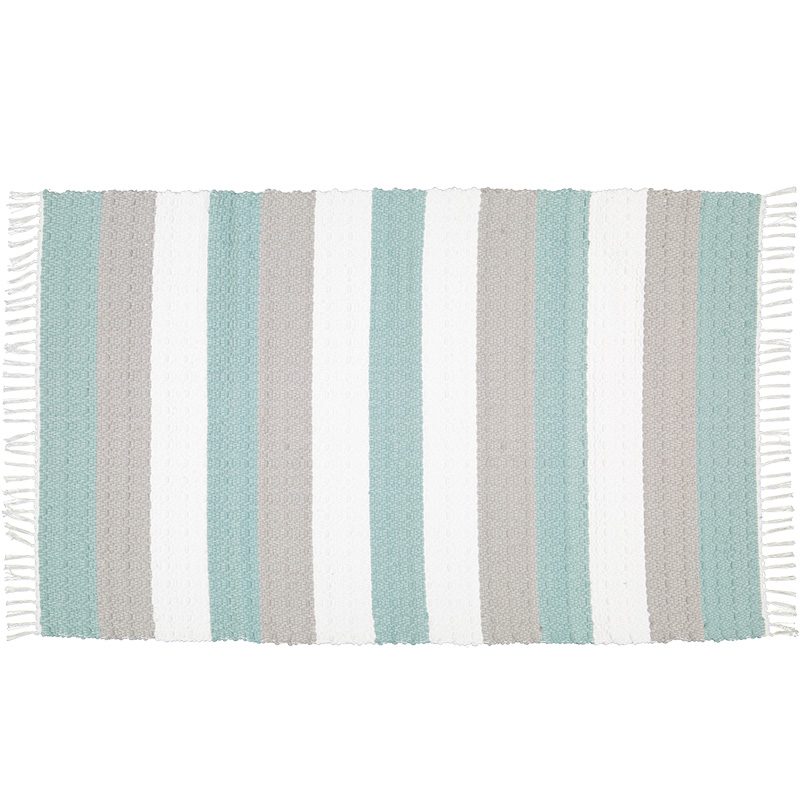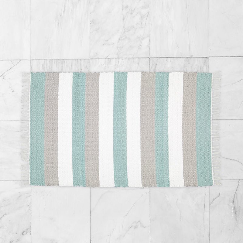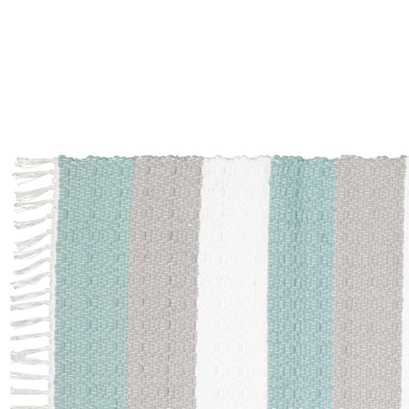 Handwoven Cotton dhurrie twill rug woven in bands of Duck egg, Grey and white.