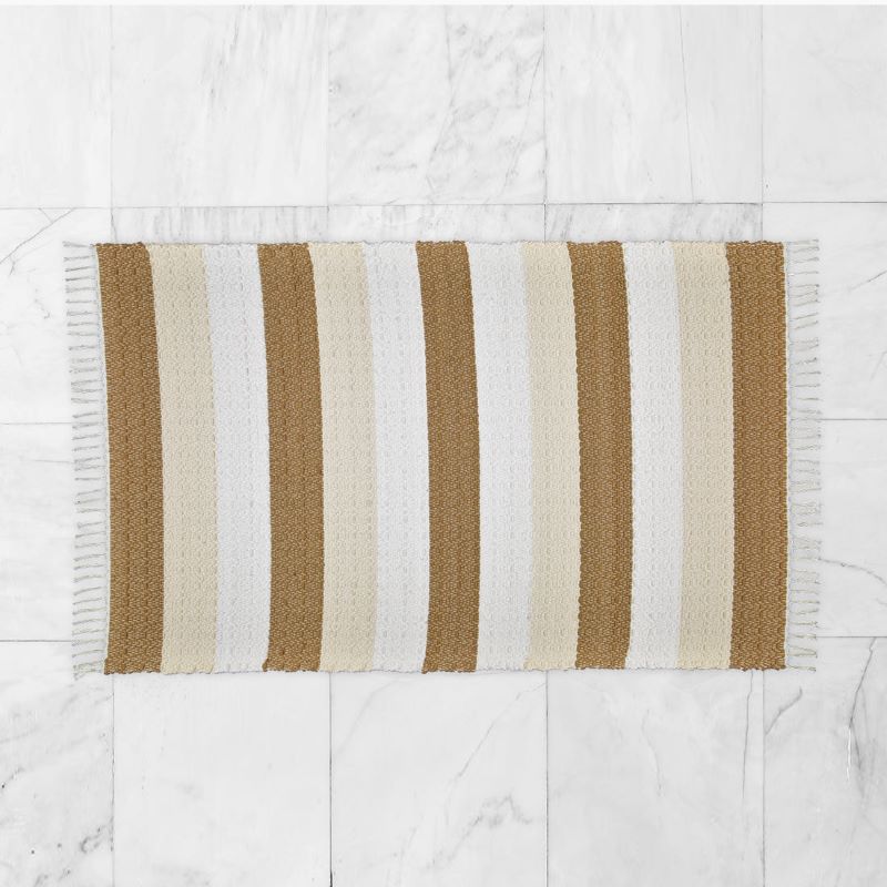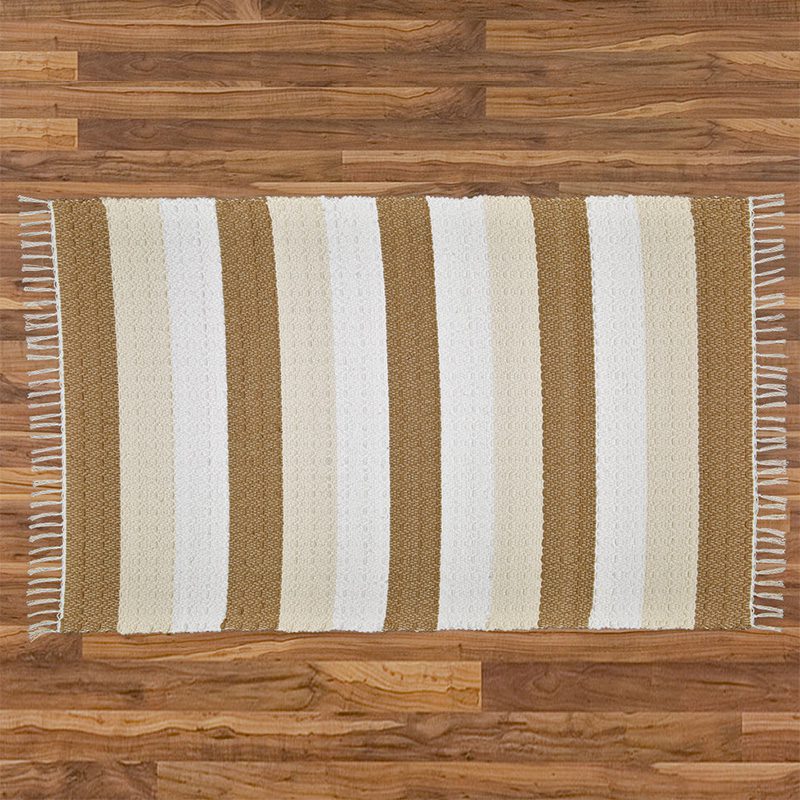 Handwoven Cotton dhurrie twill rug woven in bands of Dark stone, Natural and white.