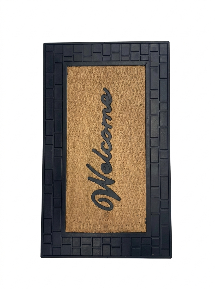 Greeting: Centered in the coir area is the word “Welcome” in a large, raised black script font.