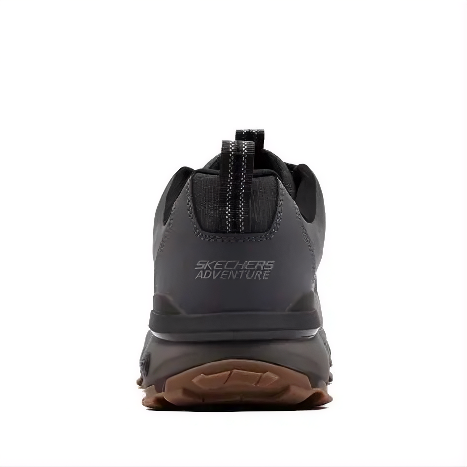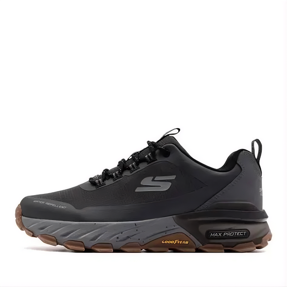 The Skechers Max Protect Charcoal shoe is designed for all-day comfort, durability, and protection, featuring a water-resistant leather and mesh upper, Air-Cooled Memory Foam insole, and a Goodyear® performance outsole for traction and support
