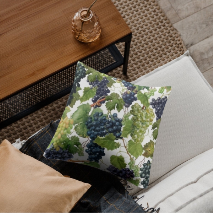 Grapes White Upholstery Fabric typically refers to a decorative textile featuring grapevine motifs on a black background, often made from durable cotton or polyester blends suitable for upholstery projects. It combines a rich vineyard-inspired design with practicality for furniture covering.