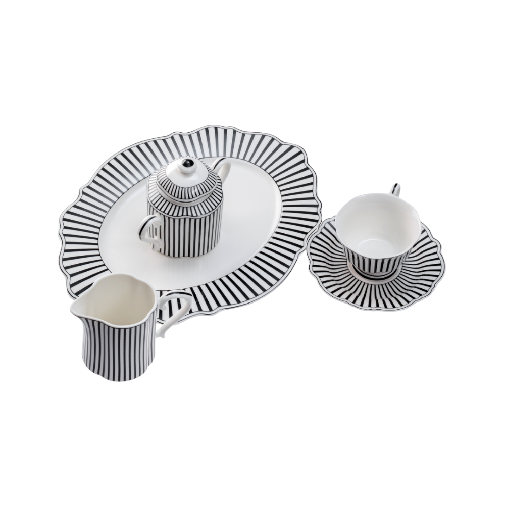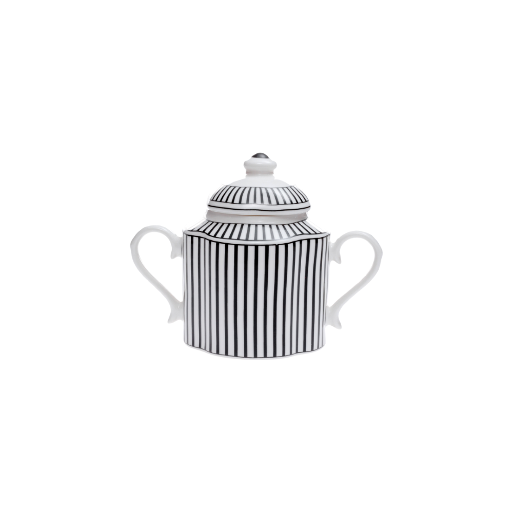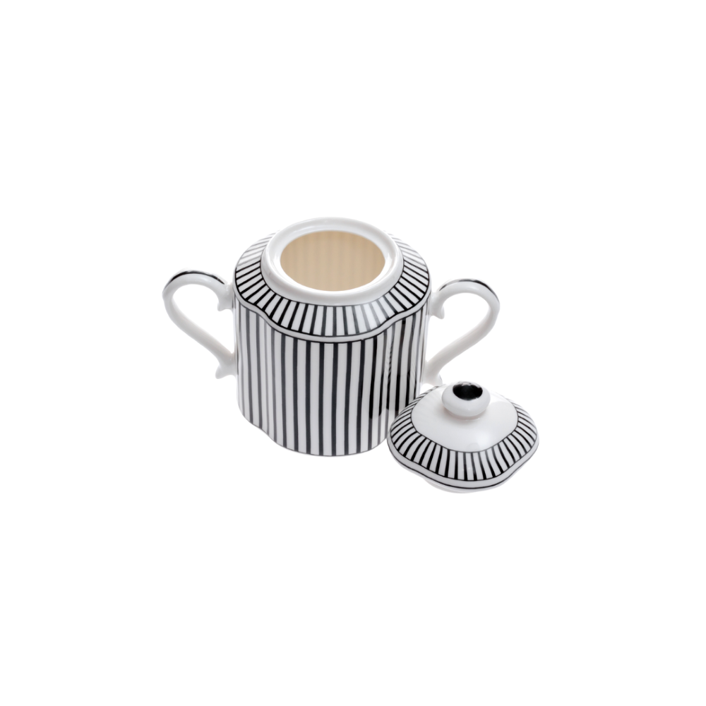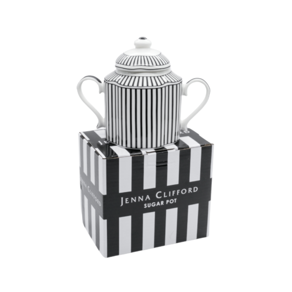 Jenna Clifford’s Ivory Noir sugar pot combines striking black stripes with the elegance of fine china. The scalloped edges and clean white base make this sugar pot not only a practical addition to your tea or coffee set but also a piece of sophisticated design. Sweeten every moment with a touch of modern elegance.