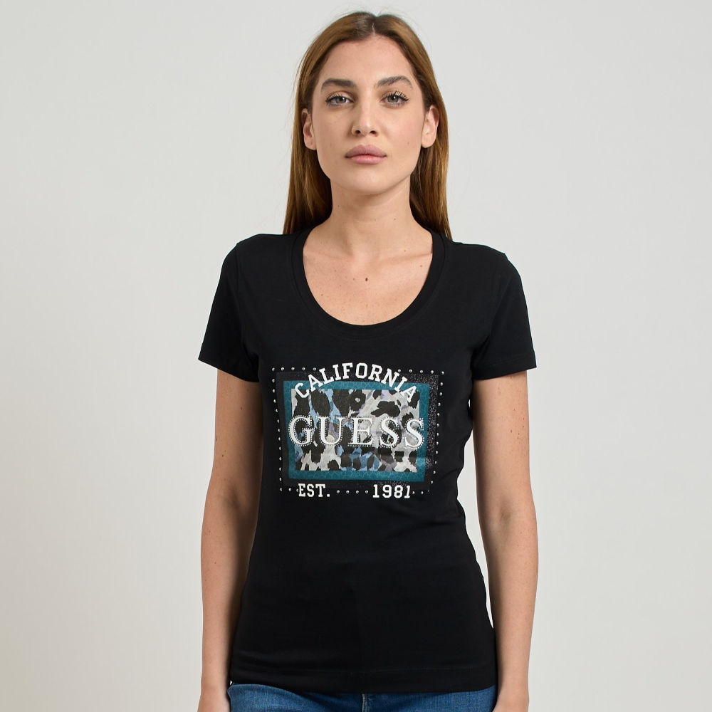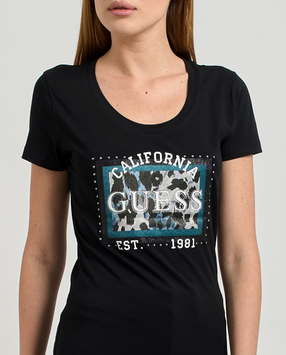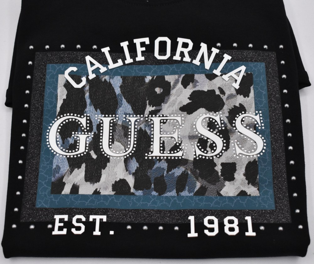 - Guess logo print: Prominently displayed on the chest, framed by anamalier (animal-inspired) graphic elements for a bold, fashion-forward look.