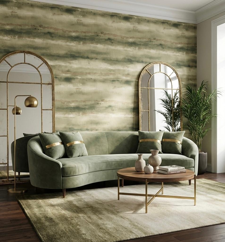 A stylish vinyl-based wallpaper from the collection, the Stratos Macha design features a brushed horizontal abstract pattern in calming champagne and green tones, evoking soft, organic movement reminiscent of misty landscapes and watercolor washes. It’s printed on textured vinyl that adds depth and tactile appeal, with a straight match layout and a 64 cm pattern repeat for seamless alignment across rolls. This wallpaper is extra washable for durability and easy maintenance, making it suitable for creating tranquil, design-forward feature walls in lounges, bedrooms, or boutique interiors